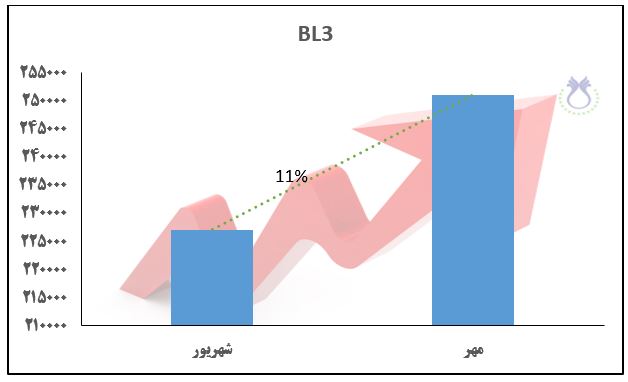 تغییرات قیمت محصولات پتروشیمی با نام پلی اتیلن سنگین بادی و شناسه BL3 از قیمت 227020 به 251097 ریال در بازه زمانی ابتدای شهریور ماه تا انتهای مهر 1400